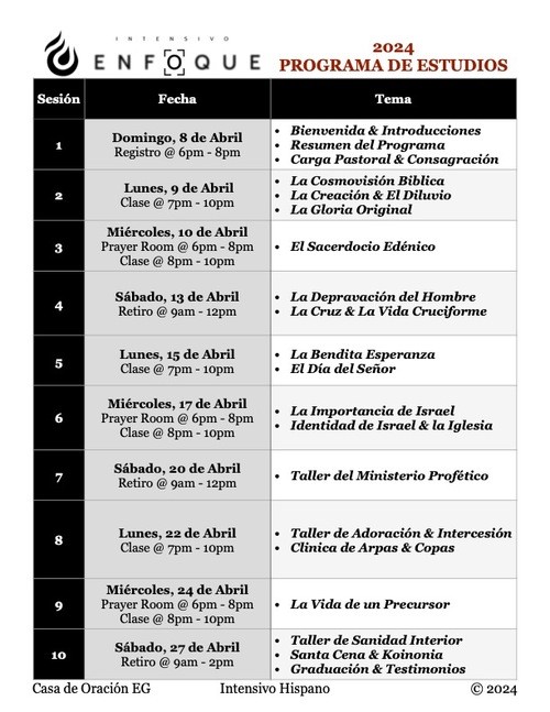 El Intensivo ENFOQUE consiste de 15 lecciones durante 20 días de consagración espiritual en intimidad con Dios por medio de tiempos intensivos de adoración, intercesión y estudio bíblicos que proporcionara un fundamento solido cuyos frutos en la vida de cada creyente perdurarán hasta la era venidera. Durante este mes habrán sesiones de impartimiento, irrumpimiento y victoria sobre areas de pecado, debilidades humanas y ataques del enemigo a medida que la Palabra De Dios efectúa madurez espiritual en la vida del creyente avivado y sometido al Espíritu Santo.